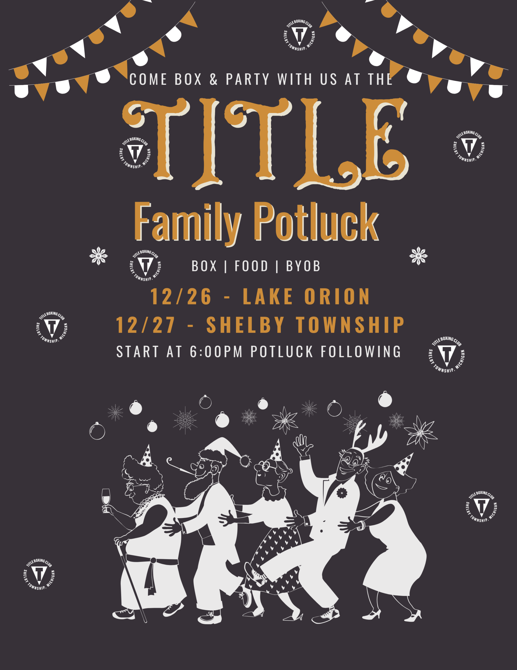 Come box and party with us at Title Shelby in celebration of the holidays! We'll hit the bags at 6pm with a potluck dinner to follow . Bring a dish to share and whatever you'd like to drink. RSVP at the club. Book your bag!